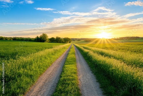 © pham, Fototapeta premium 広大な草原での朝焼けの美しい風景と小道が続く航路