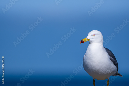 © Giichi Tanaka, Obraz premium 空がブルーのグラデーションでカモメの目の縁が赤いのが印象的で左側を向いて居る。背景はブルー色でカモメは右側で左側を向いて居る横構図です。