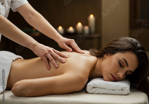 Obraz premium 温かい光に包まれた癒しのマッサージシーン 穏やかな表情の女性