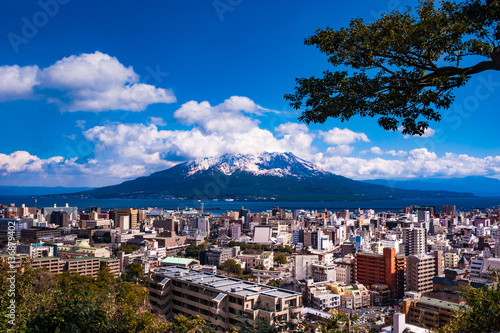 Fototapeta premium 冠雪の桜島と鹿児島市の街並み