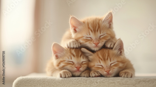 Fototapeta premium 幸せな表情で眠る三匹の茶トラ子猫 | 柔らか陽光