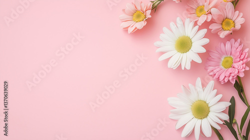 Obraz premium ピンクの背景に並ぶカーネーションや花々とつぼみ