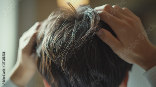 © bephoto, Obraz premium 日本人男性が髪に手を通す