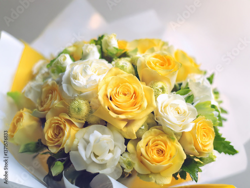 © WABISUKE, Obraz premium 黄色のバラと白い花のブーケ