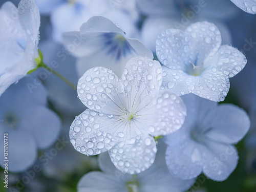 © uumm, Fototapeta premium ネモフィラの美しい花、雨上がりの水滴