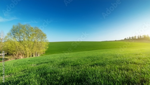 © Shousei, Fototapeta premium 春の草原と青空が広がり、隅に見える若葉が春の芽吹きと新しい始まりを感じさせるシンプルで穏やかな風景