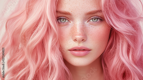Fototapeta premium 淡いピンクヘアとそばかすが魅力的な若い女性のナチュラルポートレート
