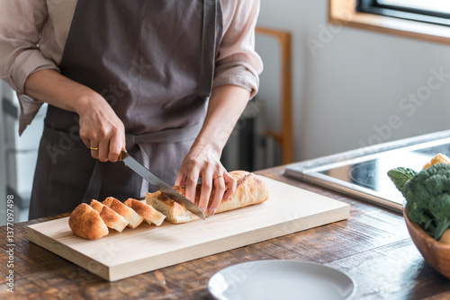 © buritora, Obraz premium フランスパンを着る女性の手元