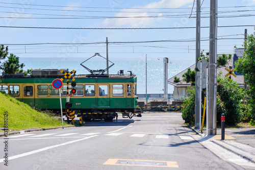 Naklejka premium 海沿いの踏切を通過する江ノ電、鎌倉、七里ヶ浜