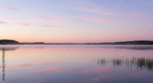 Fototapeta premium 静かな湖面、淡いピンクの朝焼けが美しく反射する