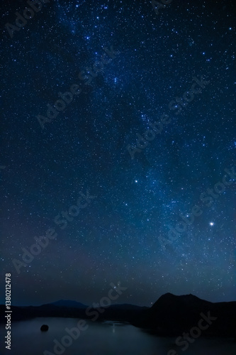 Naklejka premium 山間の湖の夜。星の煌めく空の天の川。北海道の摩周湖。