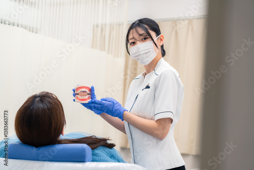 © maroke, Obraz premium 歯の模型を使って患者に説明をする歯科助手の女性