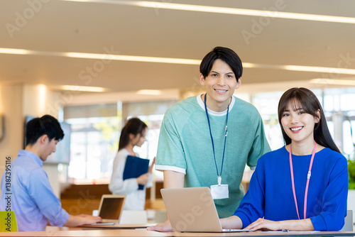 © pain au chocolat, Obraz premium オフィスで働く若いエンジニアのスタッフ 撮影協力:学校法人電波学園 東京電子専門学校
