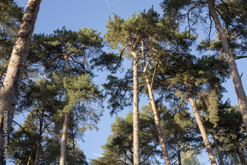 Fototapeta premium высокие, пушистые сосны на фоне голубого неба солнечным днем