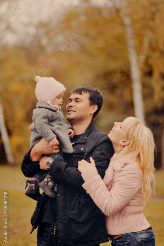 © oes, Fototapeta premium Молодые родители держат на руках маленькую дочь в осеннем парке