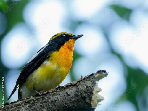 © STOCK THE WORLD, Obraz premium 森の暗い木陰で周りを見渡しているキビタキ