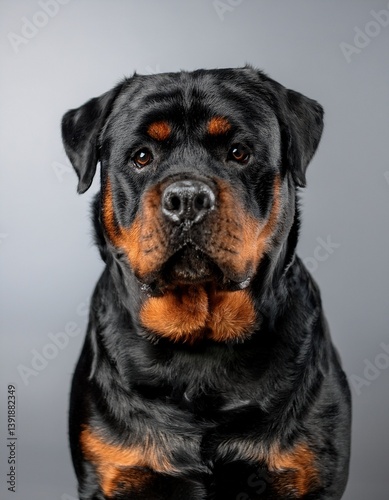 © Shousei, Obraz premium ンプルなシルバー背景に立つロットワイラー、その力強さと黒い被毛が背景と対比し、見る人に強い印象を与える存在感を作り出している