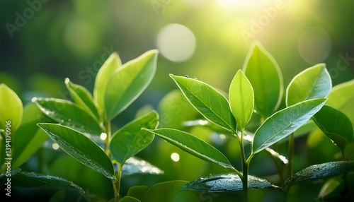 Obraz premium 春の若葉が柔らかく芽吹き、太陽の光で輝くクローズアップ。その葉の縁や表面に残る水滴が春の爽やかな風を感じさせ、自然の清々しさと新しい命の息吹を表現した素敵...