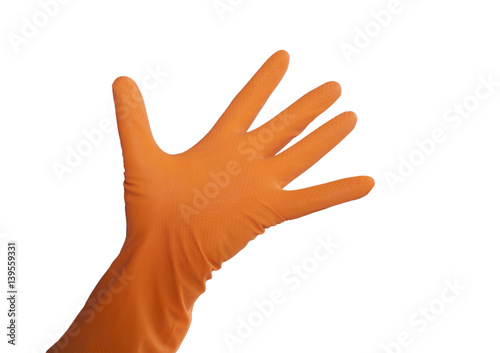 Obraz premium рука в резиновой, оранжевой перчатке, изолирована