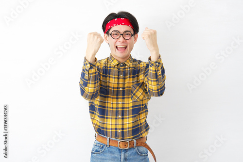 Fototapeta premium アキバ系の男性 ガッツポーズ 白背景 両手