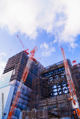 © maskin, Fototapeta premium ビル建築のクレーン 背景青空