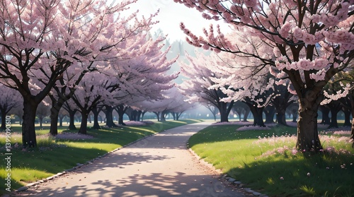 Obraz premium 春の風に揺れる桜並木と曲がりくねった小道