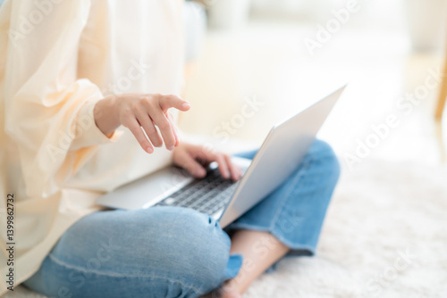 © dimlight, Fototapeta premium リビングでパソコンを使う若い女性
