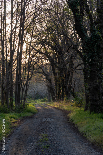 Fototapeta premium 朝日が差し込む森の中の道