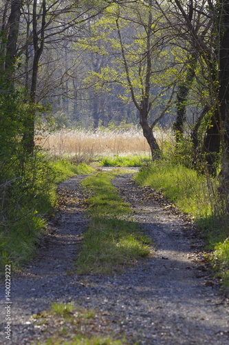 Obraz premium 朝日が差し込む春の林道