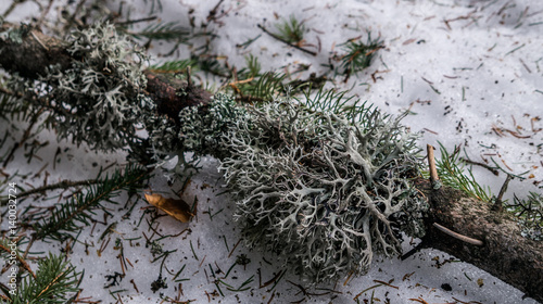 Obraz premium Растение лишайник на еловой ветке в лесу