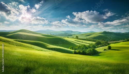 Fototapeta premium 青空の下に広がる緑の丘と牧草地、ふんわりとした雲と明るい自然光。