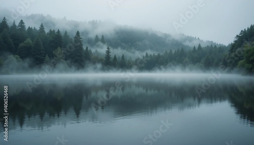 Fototapeta premium 静寂漂う霧の湖、神秘的緑の反射