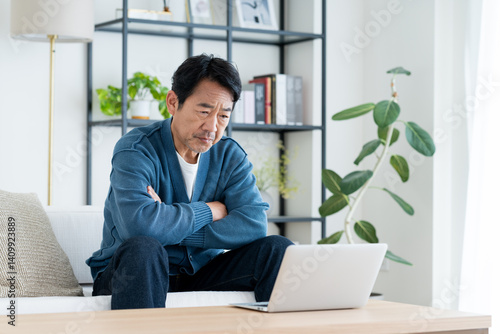 Fototapeta premium リビングでパソコンを使うミドルの男性