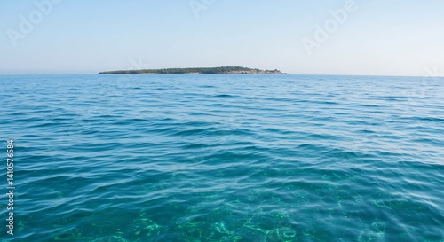Obraz premium 穏やかな青い海 遠く小さく島影 透き通る水面