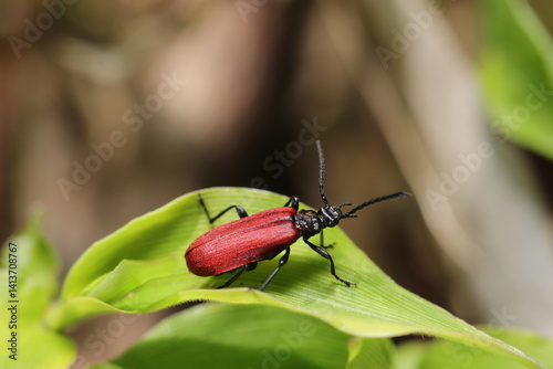 © SAIGLOBALNT, Fototapeta premium メタリックレッド美しいアカハネムシの成虫(晴天下自然光マクロ撮影)