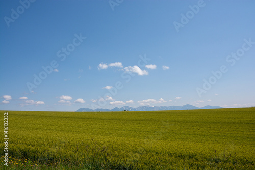 © kinpouge, Obraz premium 緑のムギ畑と雪が残る山並み 十勝岳連峰