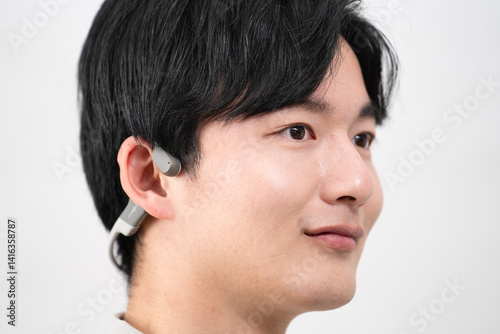 © aijiro, Obraz premium ワイヤレスイヤホンで音楽を聴く若い男性