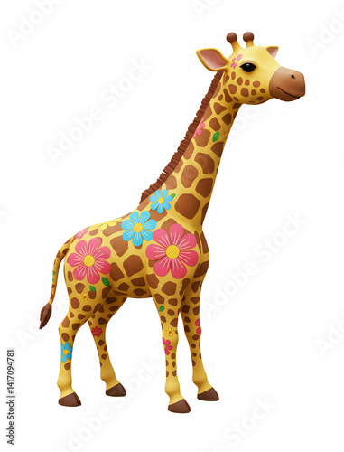 © NguyenBa, Obraz premium 可愛いキリン 華やか花柄 優しい色合いのイラスト