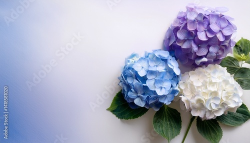Obraz premium 生成色の和紙に、青・紫・白のアジサイが三輪並び、色彩の調和が美しく響き渡る落ち着きのあるアート。