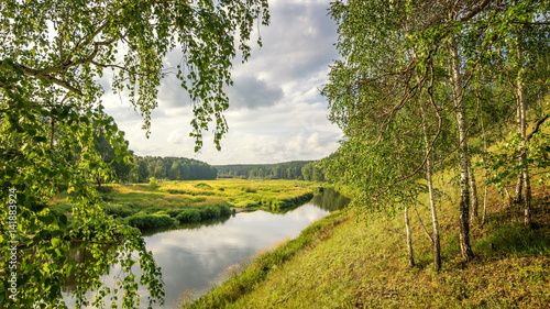Obraz premium летний пейзаж с березовой рощей и холмом, Россия, Урал