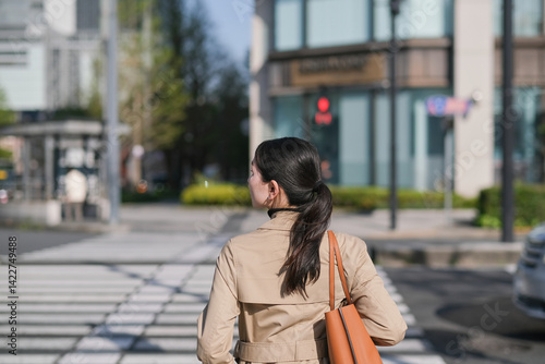 © monzenmachi, Fototapeta premium 新緑の丸の内を歩くビジネスウーマンの後ろ姿