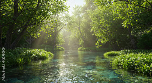 © zoy, Obraz premium 新緑と川の風景