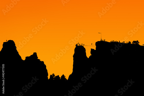 Obraz premium На вершине скалы по натянутому канату идет человек, толпа людей наблюдает за ним. Силуэт вершины скалы.