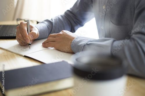 © e-stock, Obraz premium 机の上で仕事・勉強をする男性