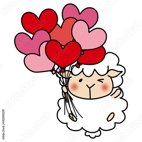 © てがきっず, Obraz premium ハートの赤い風船の束を持っている羊