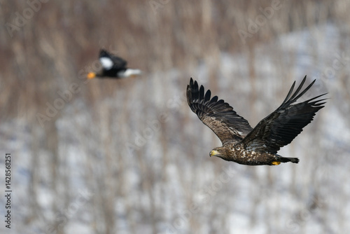 Obraz premium 冬に北海道の知床半島や釧路湿原で見られる大きな猛禽の仲間、勇敢で格好良いオジロワシ