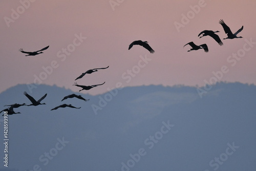 Fototapeta premium 冬に大群で九州鹿児島に訪れる、天然記念物の美しい日本の野鳥ナベヅル