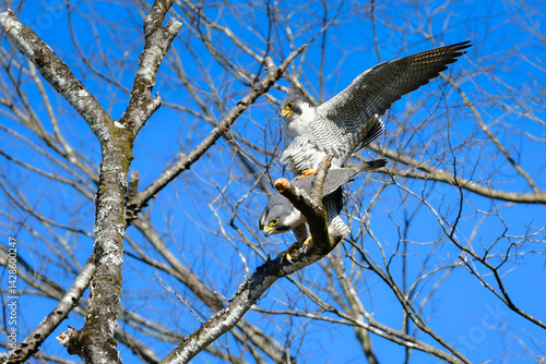 © trogon, Obraz premium 勇敢な岩場のハンター、空の王者ハヤブサのカップルの交尾