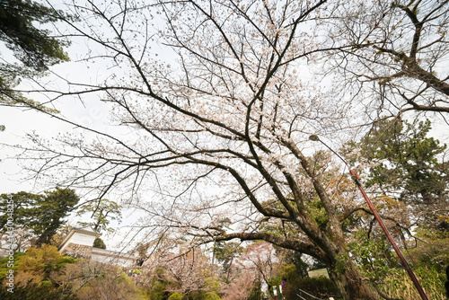 Obraz premium 満開の桜や杉、楠など、大きな木がたくさん植わっている。 日本の関東地方最大級の城、小田原城。...