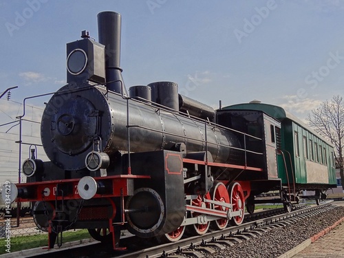 © butus, Fototapeta premium Ретро паровоз с зелёным вагоном